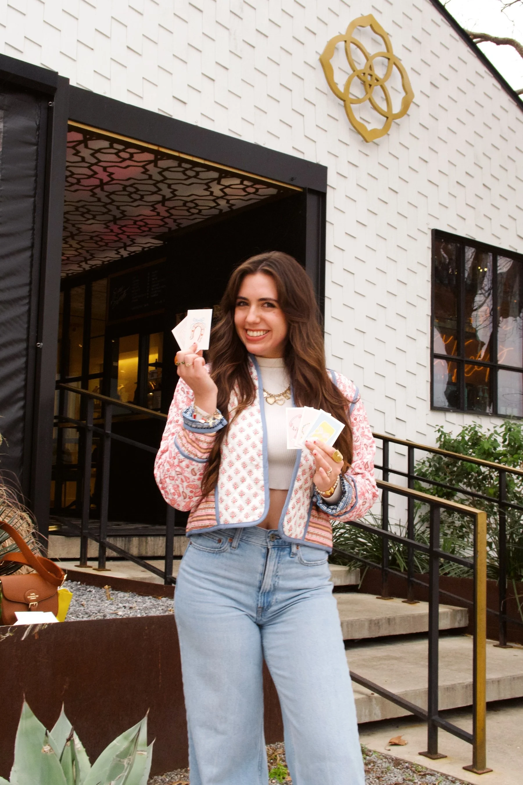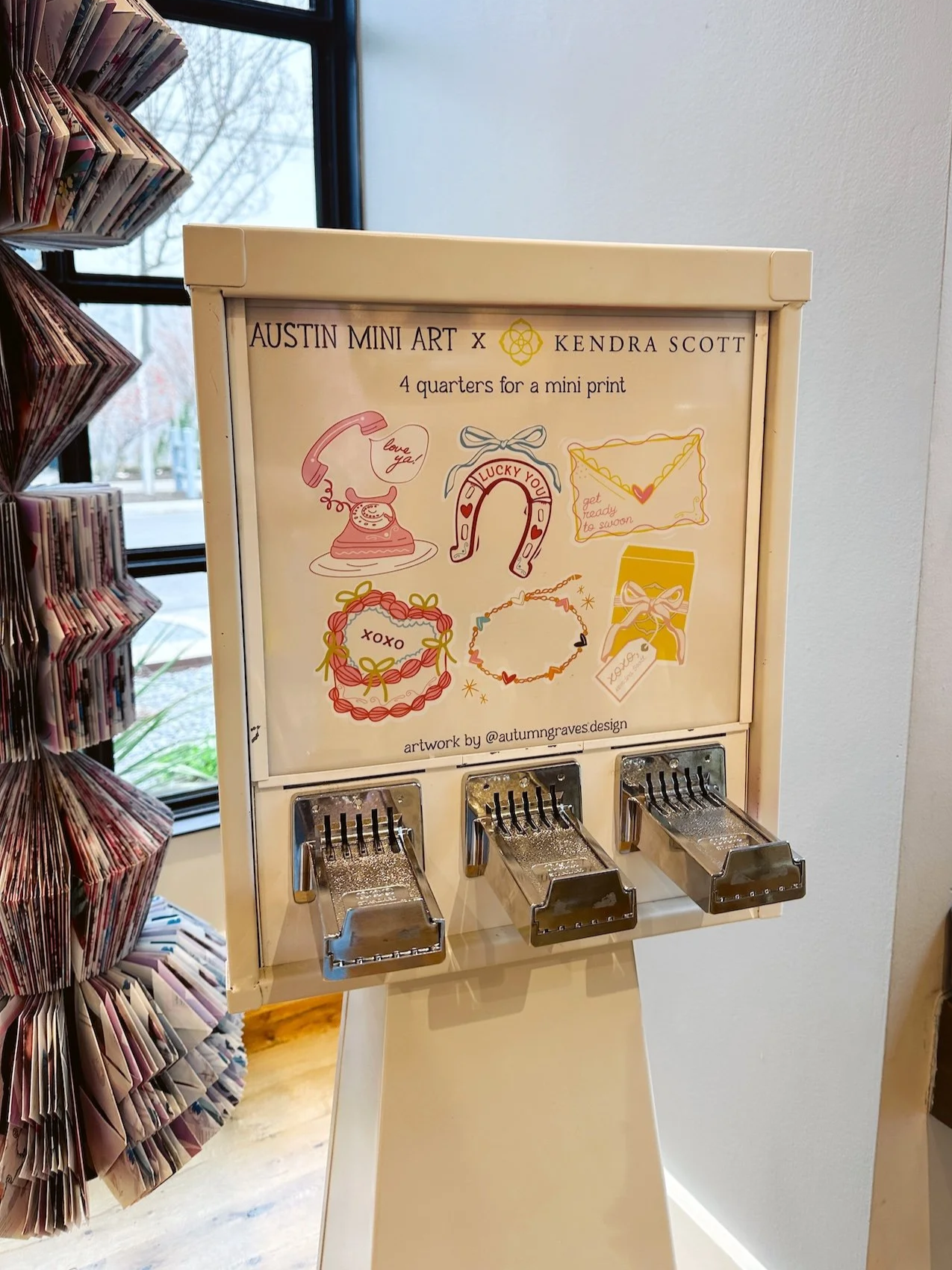 In spring 2025, I collaborated with Austin Mini Art on a custom mini print series for Kendra Scott. The project featured six hand-drawn illustrations and a custom front interface for a vintage mini vending machine. The prints sold for four quarters and were showcased in Kendra Scott’s flagship store in Austin, Texas.
